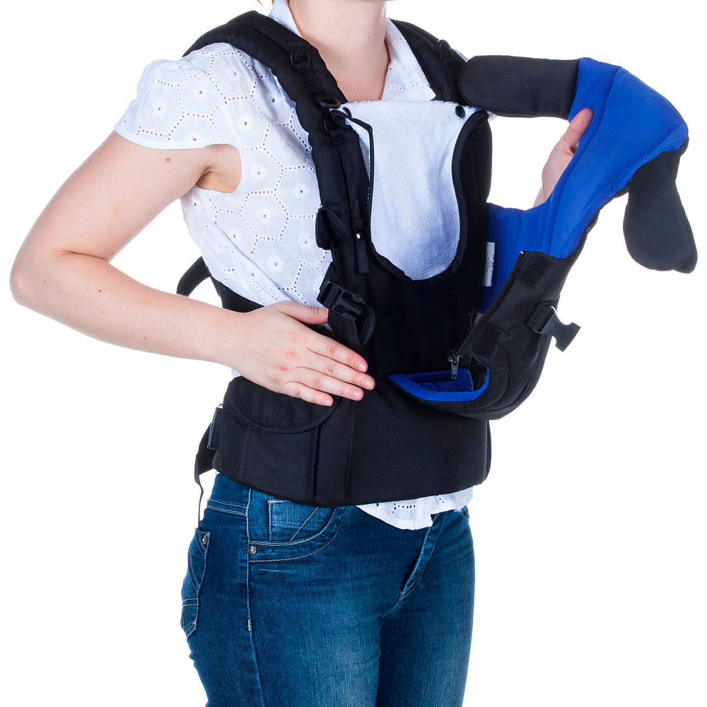 Abertura do assento com zíper para facilitar colocar e tirar o bebê, alças cruzadas em X, mais simples e seguras e o cinto abdominal com bolsos porta-objetos, aliviam o peso sobre os ombros, apoio para a cabeça do bebê com 3 posições, babador atoalhado e prendedor para chupeta.