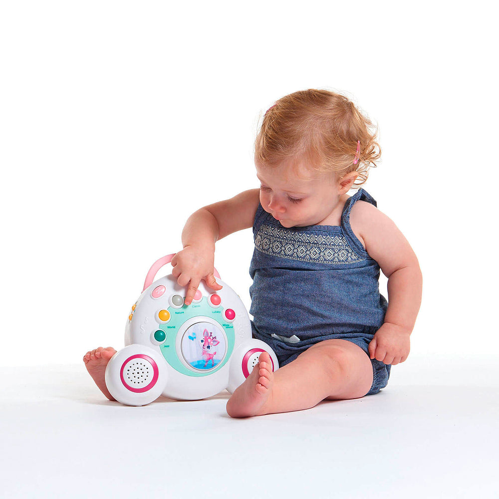 Transforma-se em caixa de música portátil e independente, com 40 minutos de música contínua. Tem botões ativados pelo bebê e alto-falantes de alta qualidade.